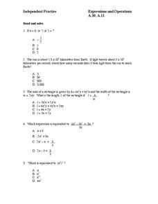 In this algebra activity, students read and solve 20 algebra problems in which they determine which of the answers available is equivalent to the expression in the problem.