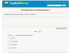 In this sentence completion worksheet, students fill in the blank for the correct word for each sentence. Students complete 10 multiple choice questions. Click on "show all" to see the rest of the worksheet.