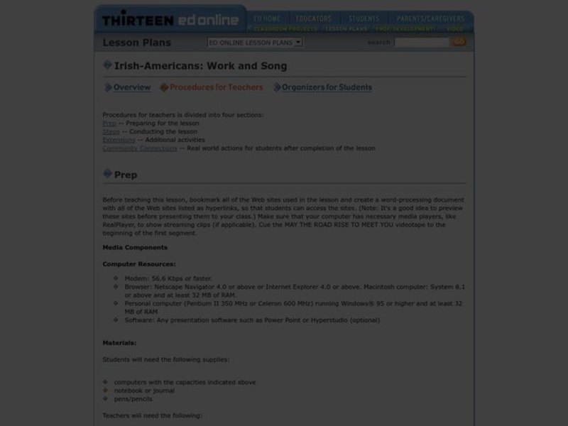 Students explore Irish-American culture. In this immigration instructional activity, students watch video segments regarding immigration in the 1840's and 1850's. Students discuss the discrimination Irish-Americans faced as they listen to songs and examine photographs of the era. Students rewrite some lyrics to standard tunes using information they uncovered in this instructional activity.