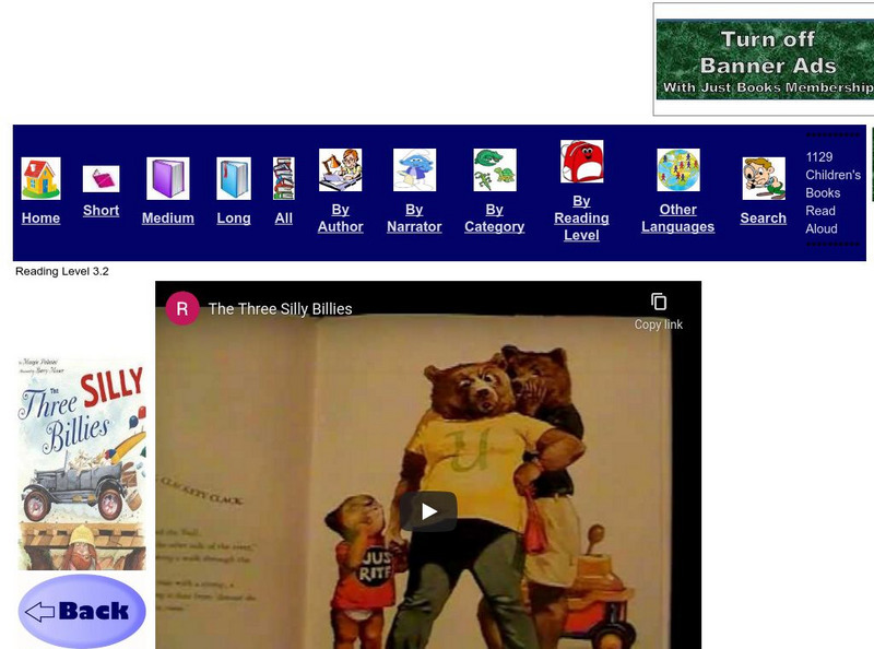 A video of the book "The Three Silly Billies", written by Margie Palatini, and illustrated by Barry Moser. Just Books Read Aloud is a site that includes children's books read aloud by normal (but enthusiastic) readers.