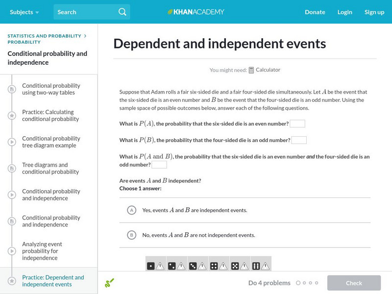 Determine if two events are dependent or independent. Students receive immediate feedback and have the opportunity to try questions repeatedly, watch a video or receive hints.