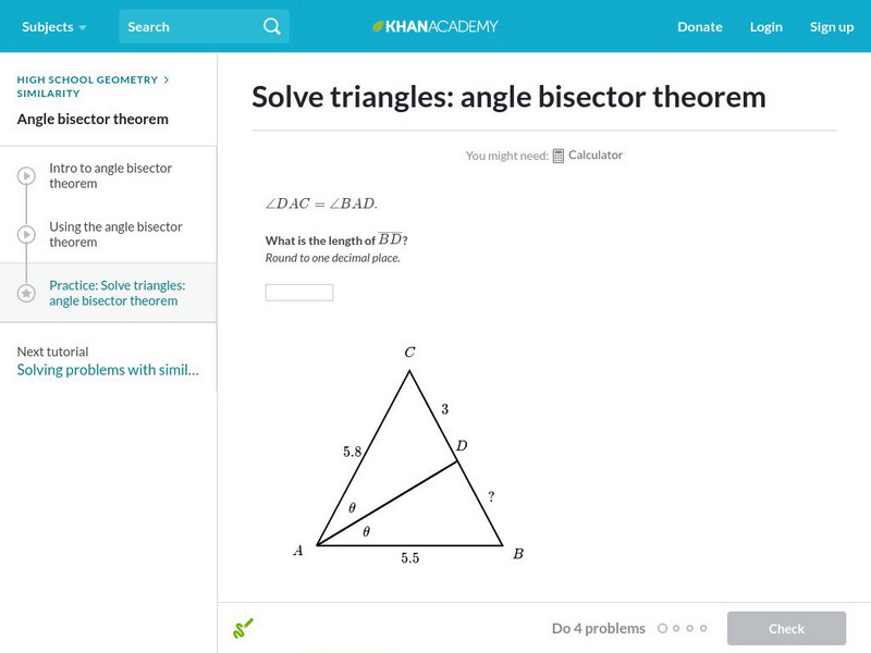 Use the Angle Bisector Theorem to find missing side lengths in triangles. Students receive immediate feedback and have the opportunity to try questions repeatedly, watch a video or receive hints.