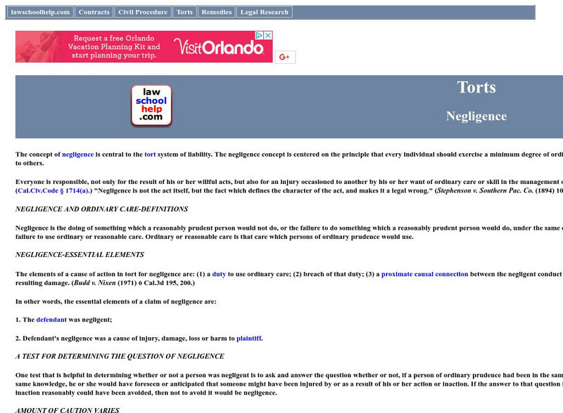 In addition to defining "negligence" and "tort," this article provides information on "negligence and ordinary care," "contributory negligence," "presumption of negligence," and related topics.