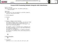 Students investigate how to evaluate the definite integral with using substitution. They evaluate expressions when using the substitution method to find the definite integral. The lesson includes example problems for the teacher to use during direct instruction.