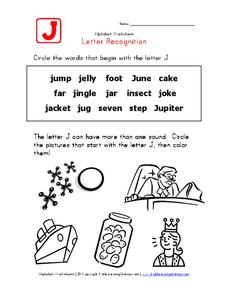 In this letter J activity, students identify the J words in a word bank by circling them. Then, students circle the pictures that start with the letter J and color them.