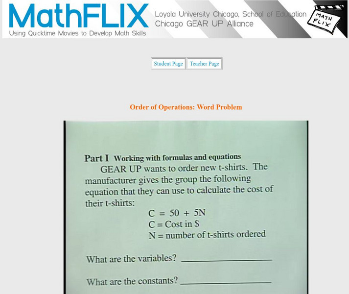 This QuickTime movie provides an opportunity to apply the order of operations to a word problem. As you watch and listen to the teacher and students interact it helps clarify the thinking behind applying this concept.