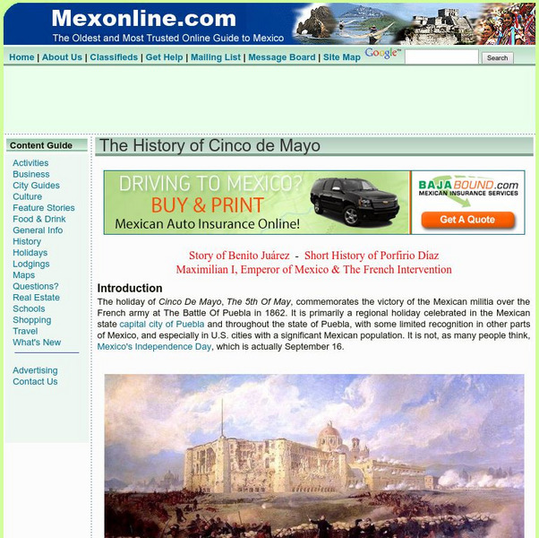 Origins of this Mexican Holiday date back to the Battle of Puebla in 1862. This site explores the events that make this a special date in Mexican history.