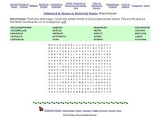 In this word search about milkweed and monarch butterflies worksheet, students use the words in the word bank to discover the words printed forward, backward, and diagonally. Students find 20 words.