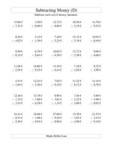 In this Euro money subtraction worksheet, students enhance their subtraction skills by subtracting the monetary amounts in increments of 2 cents. Students solve 20 problems.