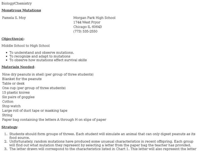 Students investigate mutations and simulate their mutation while trying to collect food. In this mutations lesson plan, students pick an identified mutation out of a paper bag. They simulate their mutation while trying to collect food items and store them to consume later. Students are timed to see how long it takes each group with a different mutation to collect the food items.