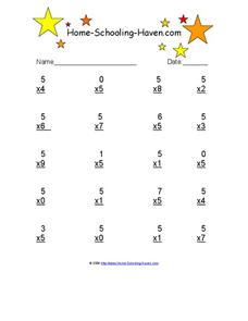 For this multiplication worksheet, students solve 12 facts in which a single digit number is multiplied by 5. This is a basic multiplication drill with problems in a vertical format.