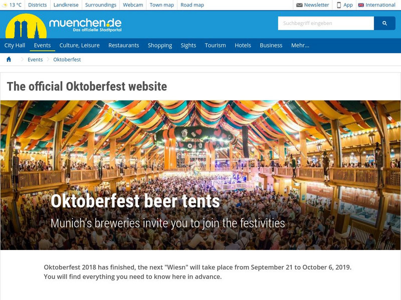 The city of Munich offers tourist information about its annual Oktoberfest. Written in English, this site explores the history of Oktoberfest, a photo gallery, event information, and much more. Other languages, including German, French, and Spanish, are also available.