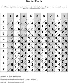 Napier Rods were created by John Napier, and are used to help with multiplication problems. The chart is very similar to a typical multiplication chart but has a unique history that learners may find interesting.