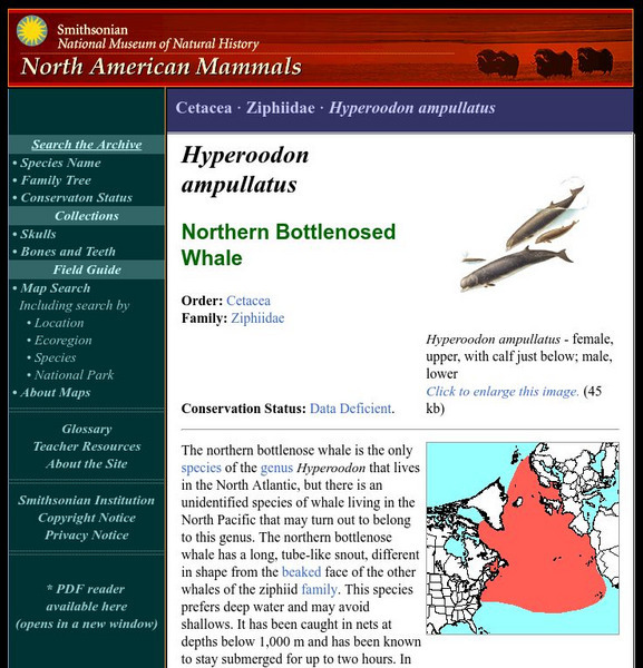The northern bottlenose whale is the only species of the genus Hyperoodon that lives in the North Atlantic, but there is an unidentified species of whale living in the North Pacific that may turn out to belong to this genus. The northern bottlenose whale has a long, tube-like snout, different in shape from the beaked face of the other whales of the ziphiid family. Learn more about the Hyperoodon ampullatus, more commonly known as a Northern Bottlenosed Whale, in this easy-to-read species overview by the Smithsonian's National Museum of Natural History.