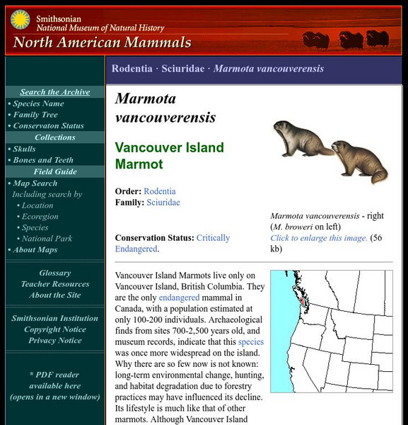 Vancouver Marmots live only on Vancouver Island, British Columbia. They are the only endangered mammal in Canada, with a population estimated at only 100-200 individuals. Learn more about the Marmota vancouverensis, more commonly known as a Vancouver Marmot, in this easy-to-read species overview by the Smithsonian's National Museum of Natural History.