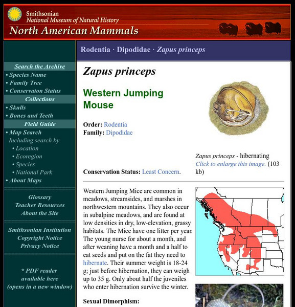 Western Jumping Mice are common in meadows, streamsides, and marshes in northwestern mountains. They also occur in subalpine meadows, and are found at low densities in dry, low-elevation, grassy habitats. Learn more about the Zapus princeps, more commonly known as a Western Jumping Mouse, in this easy-to-read species overview by the Smithsonian's National Museum of Natural History.