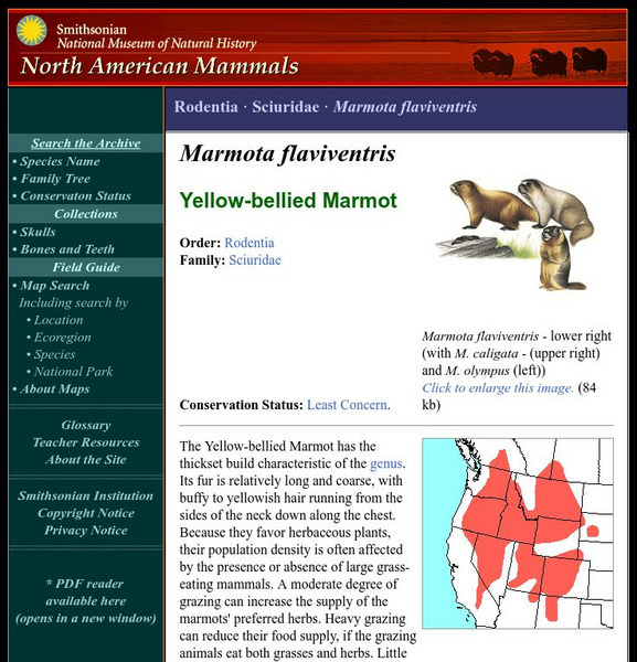 The Yellow-bellied Marmot has the thickset build characteristic of the genus. Its fur is relatively long and coarse, with buffy to yellowish hair running from the sides of the neck down along the chest. Learn more about the Marmota flaviventris, more commonly known as a Yellow-bellied Marmot, in this easy-to-read species overview by the Smithsonian's National Museum of Natural History.