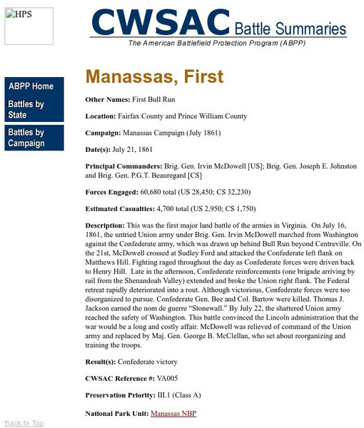 irvin mcdowell, p.g.t beauregard, "stonewall" jackson, american civil war, cwsac: civil war battle summaries: manassas, first, civil war battle summaries, civil war battles, civil war sites advisory commission, first battle of bull run, first manassas, joseph e. johnston, manassas, nps, national park service, thomas "stonewall" jackson, u.s. civil war, us national parks, union retreat, casualties at bull run, losses at bull run, first battle of bull run or manassas