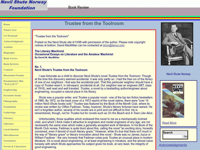 The site is written by a man who fell in love with Shute's book "as a mechnically inclined child." In addition to a brief biography, MacMillan talks about the plot and importance of the novel.