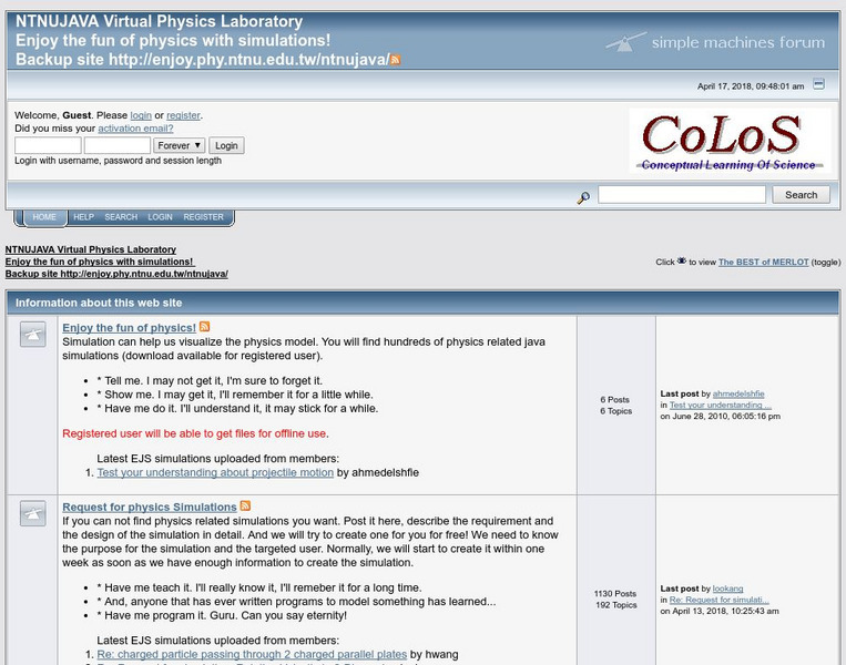 The National Taiwan Normal University maintains this educational physics resource that features a comprehensive selection of interactive JAVA simulations. Many are accompanied by guest comments and discussions. Some portions of the site are available to registered members only.