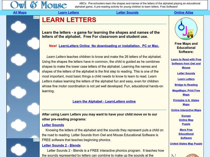 This site provides three Freeware programs to help students learn the letters of the alphabet and letter-sound correspondence. Students need to be able to use a mouse to manipulate the images on the site. Instructions for downloading the programs are simple and the download is quick.