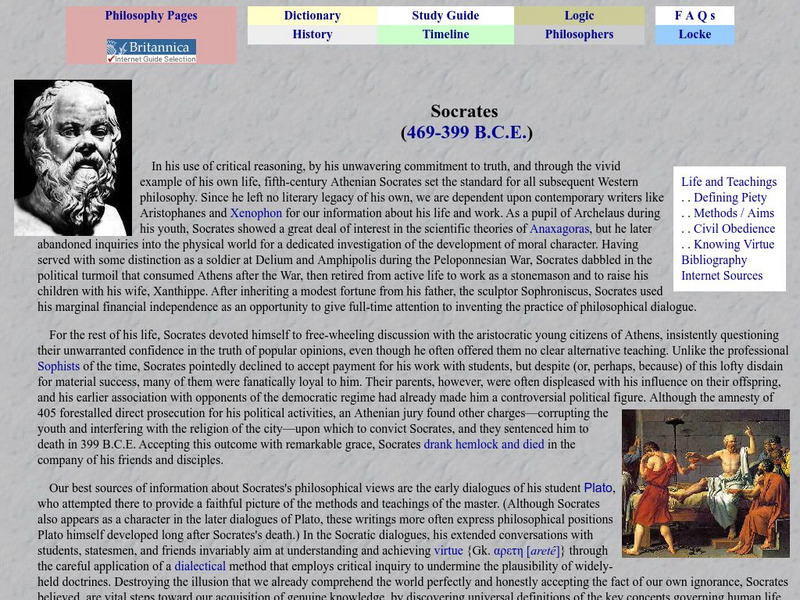 Basic-level introduction to Socrates' life. Excellent summary of the main characteristics of Socrates' life in the three dialogues "Euthyphro," "Apology," and "Crito."