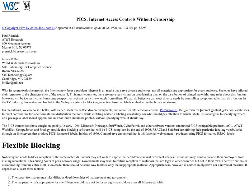 An article on the PICS (Platform for Internet Content Selection). Includes flexible blocking with illustrations, what PICS doesn't specify, and other uses for labels.