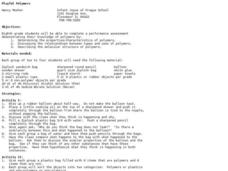 Eighth graders investigate polymers and their structures. In this polymers lesson, 8th graders perform 6 activities to learn about polymers and their molecular structure. They categorize a bag of items as polymers and non-polymers based on their characteristics and they make silly putty polymers in the lab. They prove their understanding of polymer structure by answering 4 performance assessment questions.