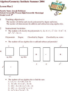 Ninth graders classify and solve polynomials. They use algebra tiles to add or subtract polynomials. Students solve the area of specific rectangles using algebra tiles. Students identify coefficients and classify polynomials.