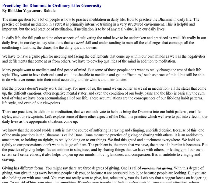 This site contains an essay on how Buddhists can practice generosity in their everyday lives. It describes the different kinds of giving and generosity.