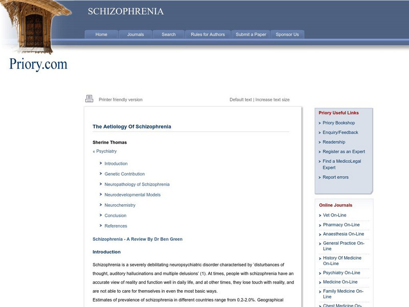 This site has an introduction to schizophrenia, how genetics contribute to schizophrenia, neuropathology, neurodevelopmental modes, and neurochemistry.