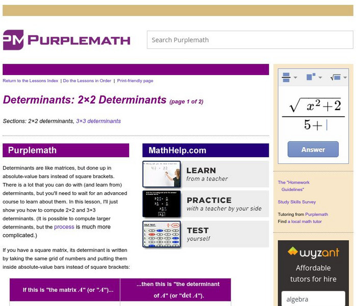 A complete lesson on matrix determinants is offered here. From explanation of what a determinant is to how to find the determinant of a 2x2 or 3x3 matrix. Steps are written in and shown for the student or teacher's use. Also provided are the keystrokes needed to find the determinant of a matrix on a graphing calculator.