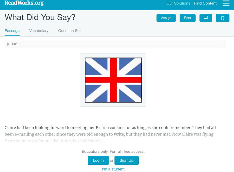 [Free Registration/Login Required] A literary text about a girl named Claire who had to learn some new words when she went to visit her British cousins. A question sheet is available to help students build skills in reading comprehension.