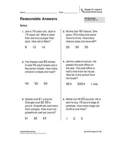In this reasonable answers worksheet, students solve the word problems by comparing numbers and finding the most reasonable answer for each set of numbers.