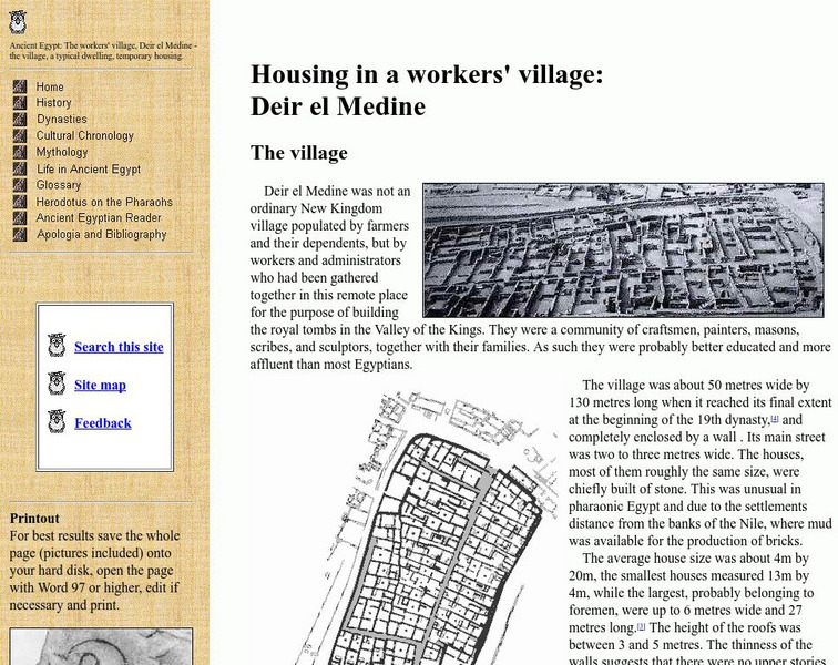 Find out about the village built for the craftsmen who built the monuments in the Valley of the Kings. See a floor plan and read about the building techniques. Hyperlinks for more information and links to other websites for additional research.
