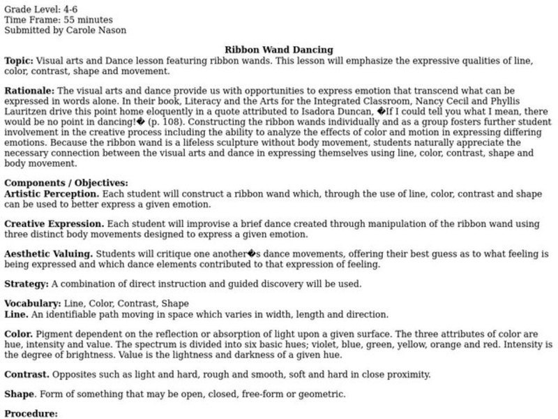 Students construct a ribbon wand which, through the use of line, color, contrast and shape can be used to better express a given emotion. They create a dance using the ribbon wand.