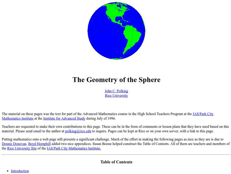 This site provides you with a table of contents about spheres. It links to topics such as basic information about spheres, area of the sphere, and Girard's Theorem.