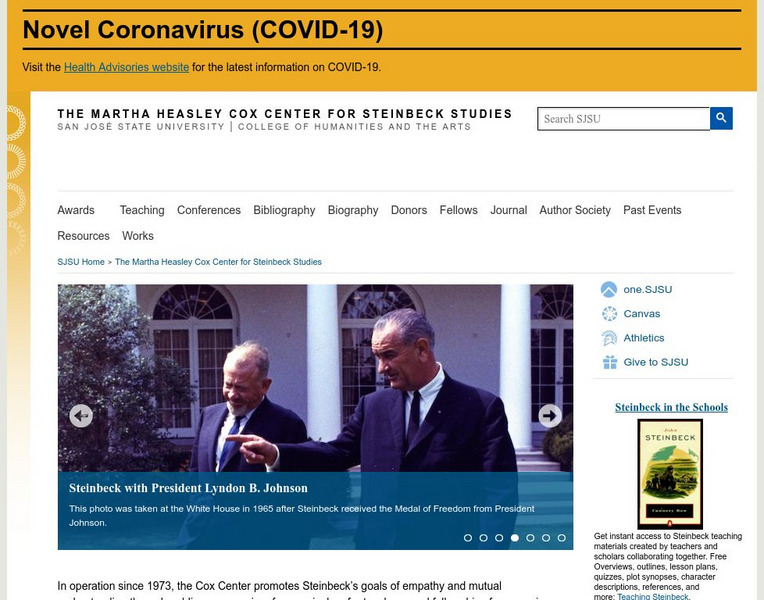 The Center for Steinbeck Studies provided biographical resources, a bibliography, and appraisals of novelist John Steinbeck life and work, which includes his Great Depression-era classics Of Mice and Men and The Grapes of Wrath.