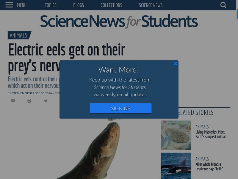 Article reports on how electric eels use bursts of electricity to control the movements of their prey. Includes a list of key vocabulary and a video.