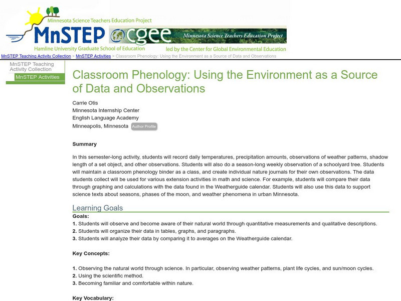 A unit where students record daily temperatures, precipitation amounts, observations of weather patterns, shadow length of a set object, and other observations. In addition, they will complete a season-long weekly observation of a schoolyard tree. Students will maintain a classroom phenology binder as a class, and create individual nature journals for their own observations.