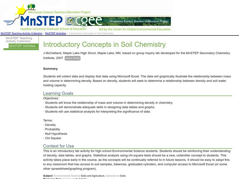 In this introductory lab activity, students will collect data that will graphically illustrate the relationship between mass and volume in determining the density in chemistry. Based on density, students will seek to determine a relationship between density and soil water holding capacity.