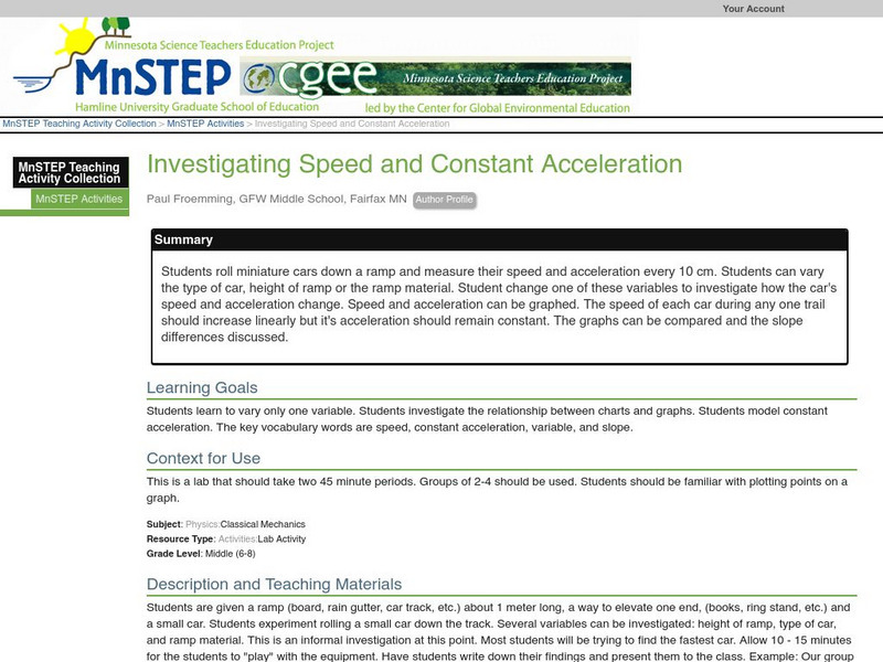 Students roll miniature cars down a ramp and measure their speed and acceleration every 10 cm. Students can vary the type of car, height of ramp or the ramp material. Student change one of these variables to investigate how the car's speed and acceleration change. Speed and acceleration can be graphed. The speed of each car during any one trail should increase linearly but it's acceleration should remain constant. The graphs can be compared and the slope differences discussed.