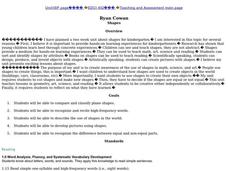 Learners participate in a number of hands-on shape-related activities. They match and sort shapes by attribute, read books about shapes, complete shape art projects and explore and compare parts of shapes.