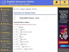 In this simple past tense worksheet, students complete sentences by choosing either 'was' or 'were' from a drop down list. ESL appropriate but not exclusive.