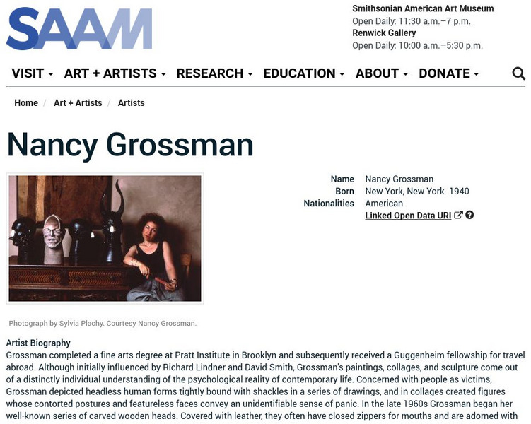 As part of the Smithsonian Art Museum's database of artists, Nancy Grossman is described here along with information on her contributions to art through sculpture, paintings, and collages. While the site does not show any individual pictures of Grossman's work, it does make reference to individual sculptures.
