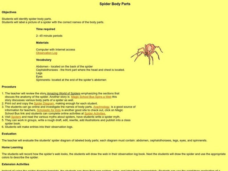 Students identify spider body parts. In this arachnid instructional activity, students review the story Amazing World of Spiders and discuss the various spider body parts. Students fill in the correct body parts on a copy of a blank spider diagram. Students work in groups to write a spider myth.