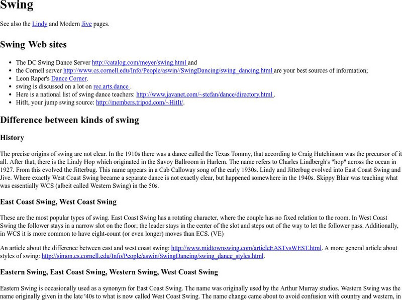 This site contains links, history of, types of, music of, and books about swing dancing.