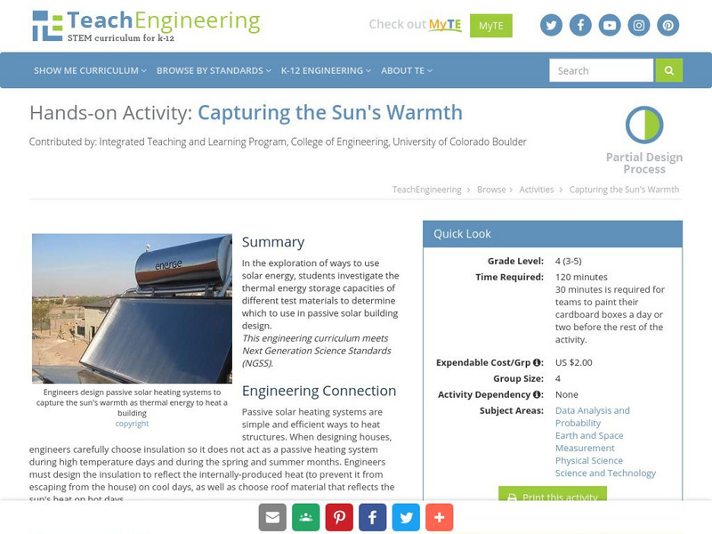 In the exploration of ways to use solar energy, students investigate the thermal energy storage capacities of different test materials to determine which to use in passive solar building design.