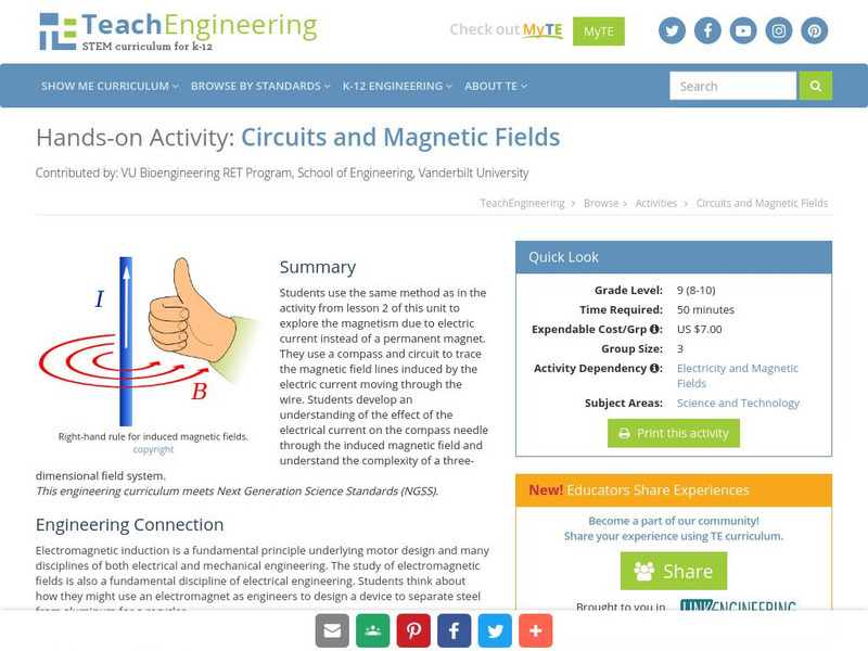 In this activity, students use the same method as in the activity from lesson 2 to explore the magnetism due to electric current instead of a permanent magnet. Students use a compass and circuit to trace the magnetic field lines induced by the electric current moving through the wire. Students develop an understanding of the effect of the electrical current on the compass needle through the induced magnetic field and understand the complexity of a three dimensional field system.