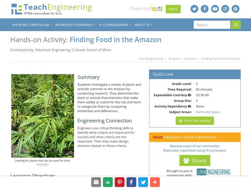 In this activity, the students will investigate a variety of plants and animals common to the Amazon through research. They will determine the plant or animal characteristics that make them edible or useful for the trip and learn to categorize them by comparing similarities and/or differences.